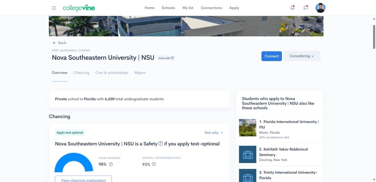 below is an example of what it looks like. so one of my safety schools is NSU. CollegeVine tells me i have a 98% chance of getting in and has a connect button for NSU. CollegeVine also messages me when a college is interested in me. i am not sponsored, trust me. this is just a really good tool to have and i use it A LOT.
